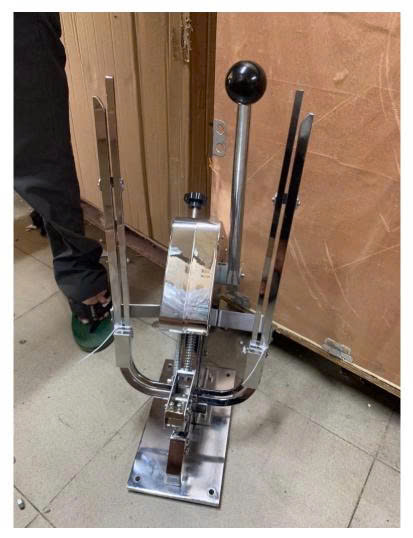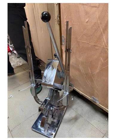 Tay cầm máy cao, được thiết kế dạng thẳng đứng, bên cạnh đó bộ phận lắp ghim đơn giản, được thiết kế như ghim sách. Khi xúc xích đã được nhồi, chuyển qua máy dập ghim, máy có khả năng làm việc liên tục, công suất cao hơn rất nhiều lần so với làm bằng tay.